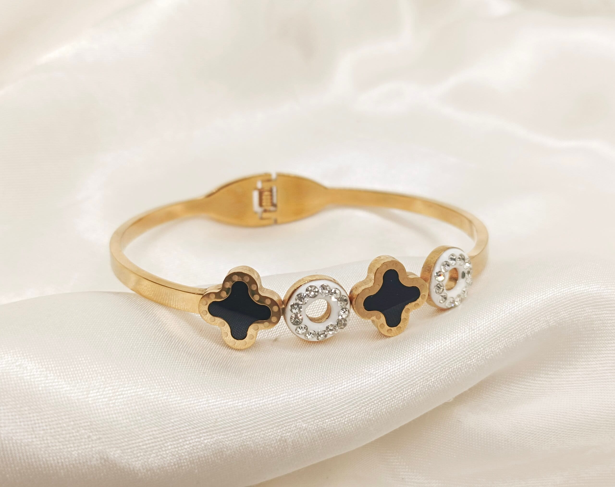 Stainless Steel Clover Stones Handcuff Elevate your elegance with this Premium Clover stones handcuff, crafted from high-quality stainless steel for lasting durability and shine. Featuring a chic black and white color scheme, this bangle is adorned with a timeless clover loop design. The bangle is hypoallergenic, anti-tarnish, and water-resistant, ensuring it retains its polished look while being gentle on the skin. Its sleek design makes it perfect for both casual and formal occasions, adding a sophisticated touch to any outfit. Whether worn solo or stacked, this luxurious piece is the perfect blend of style and functionality."