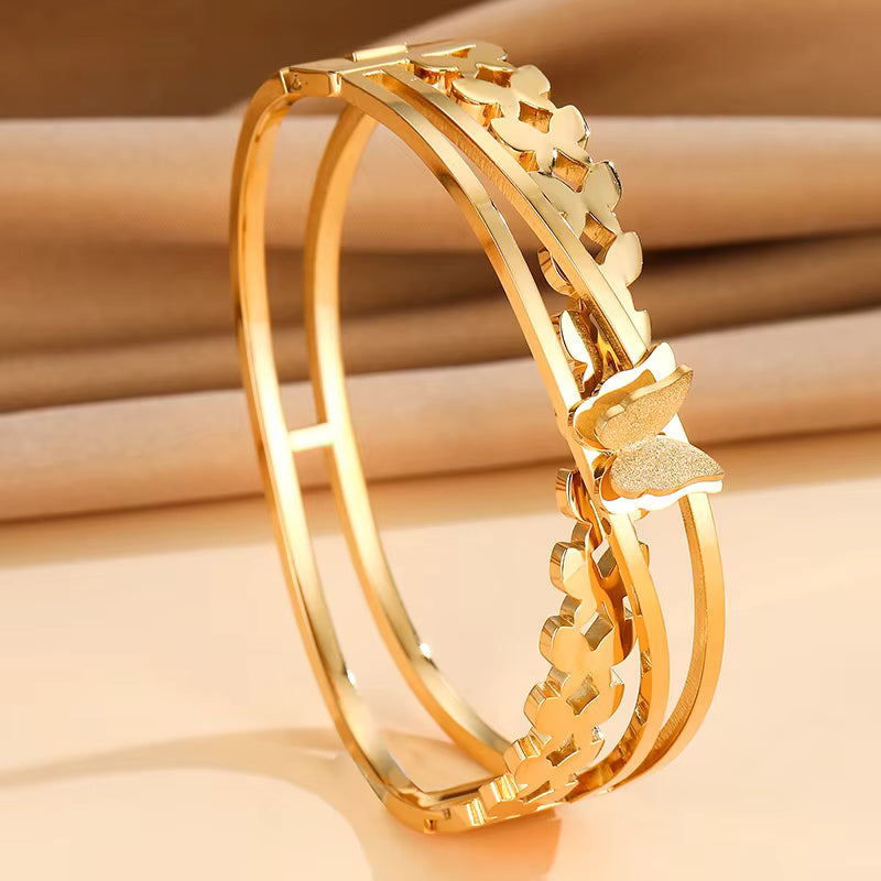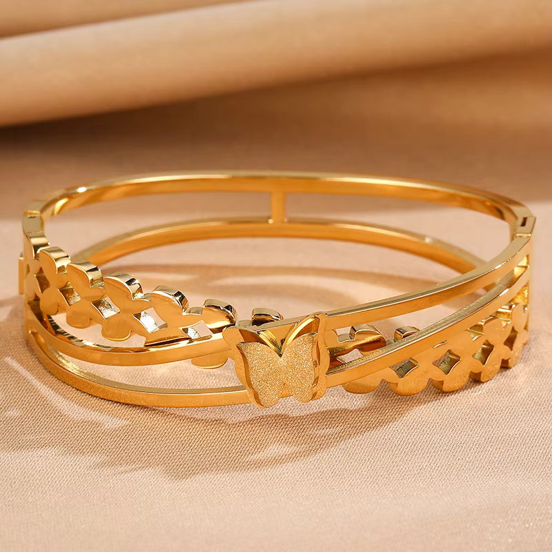 "Elevate your elegance with this Premium Butterfly Handcuff Bangle, Crafted from high-quality stainless steel for lasting durability and shine.