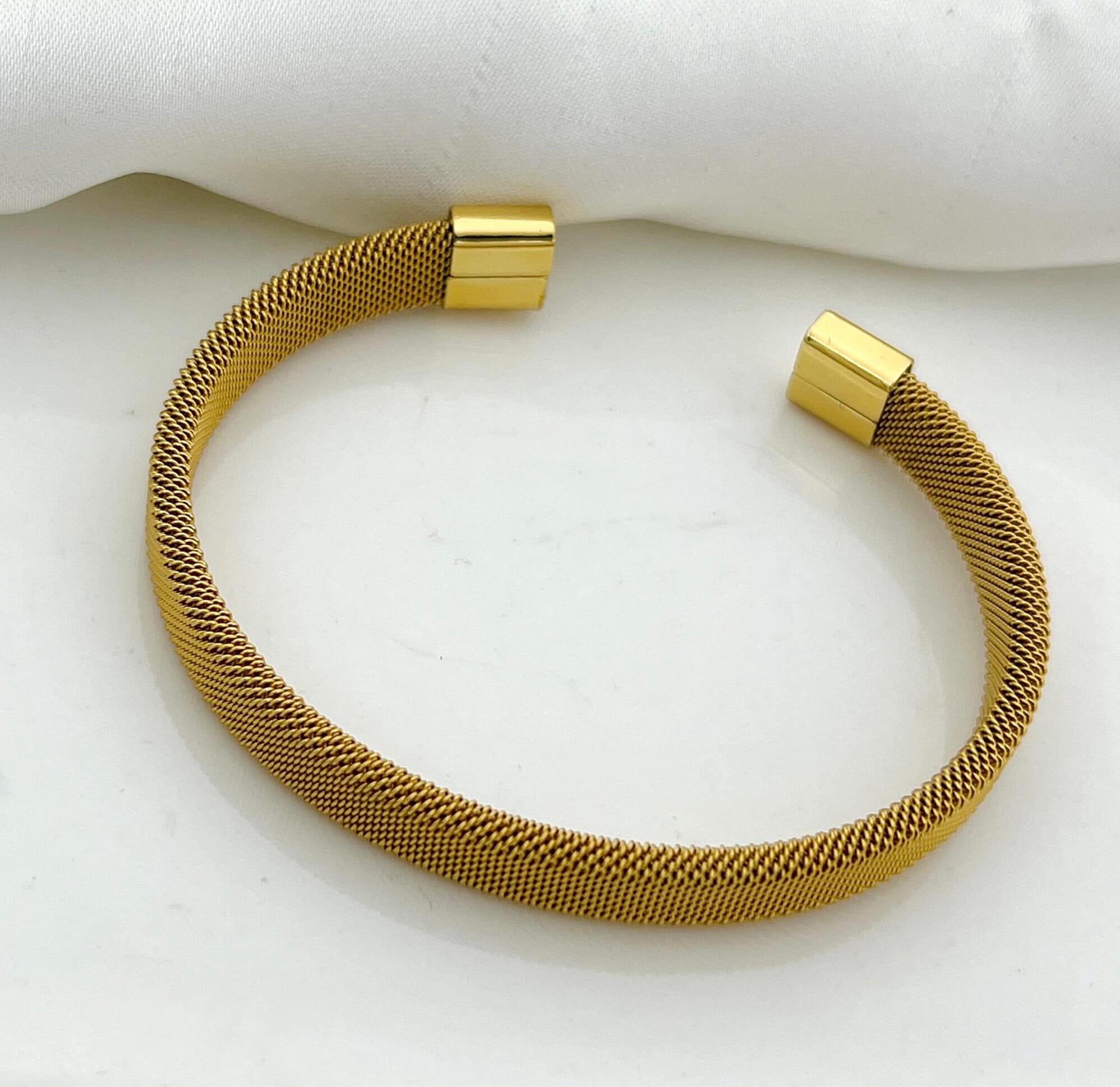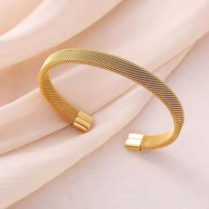 Elevate your jewelry collection with our Gold Plated Mesh Bangle, a perfect blend of luxury and durability. Crafted with a sleek mesh design, this bangle offers a sophisticated and modern look. Made from high-quality stainless steel with a gold-plated finish, it is waterproof, tarnish-resistant, and hypoallergenic, ensuring long-lasting shine and comfort. Ideal for daily wear or special occasions, this elegant piece is a must-have for effortless style. 🔹 Material: Stainless Steel with Gold Plating 🔹 Design: Stylish & Flexible Mesh Pattern 🔹 Durability: Waterproof & Tarnish-Resistant 🔹 Lightweight & Comfortable for All-Day Wear ✨ Perfect for stacking or wearing solo!