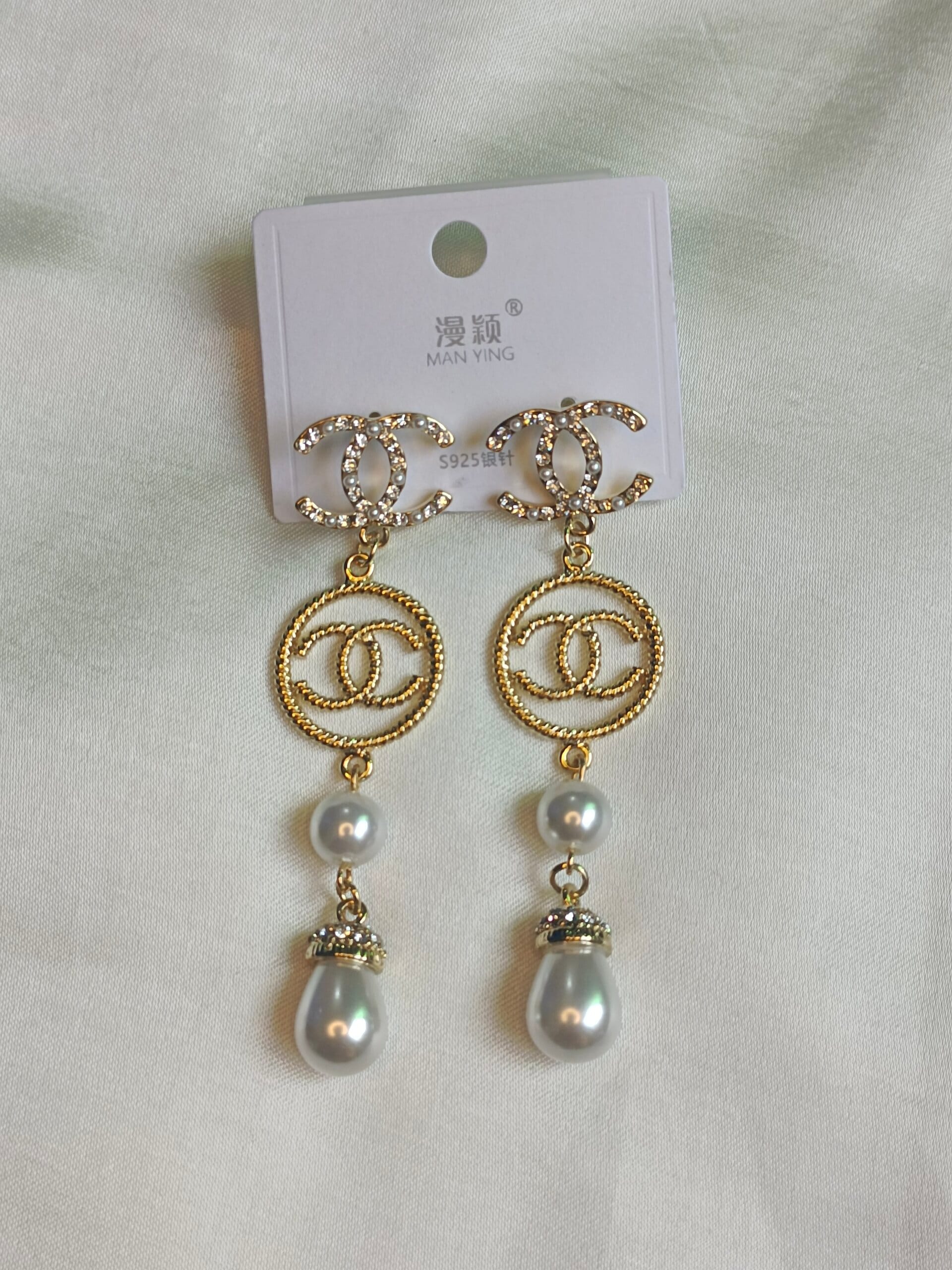 Premium Quality Branded Stainless Steel Rhinestone Pearl Drop CC Luxury Earrings