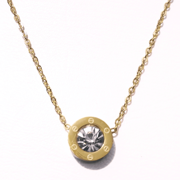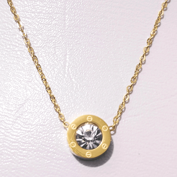 This elegant designer inspired necklace is crafted with stainless steel and features a sparkling round cut Zircon stone set in gold pendant. This stunning delicate style necklace is the perfect all-day jewelery for dressing up any outfit.
