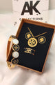 - Set Includes: Necklace, bracelet, ring, and earrings, all designed with a branded, modern look