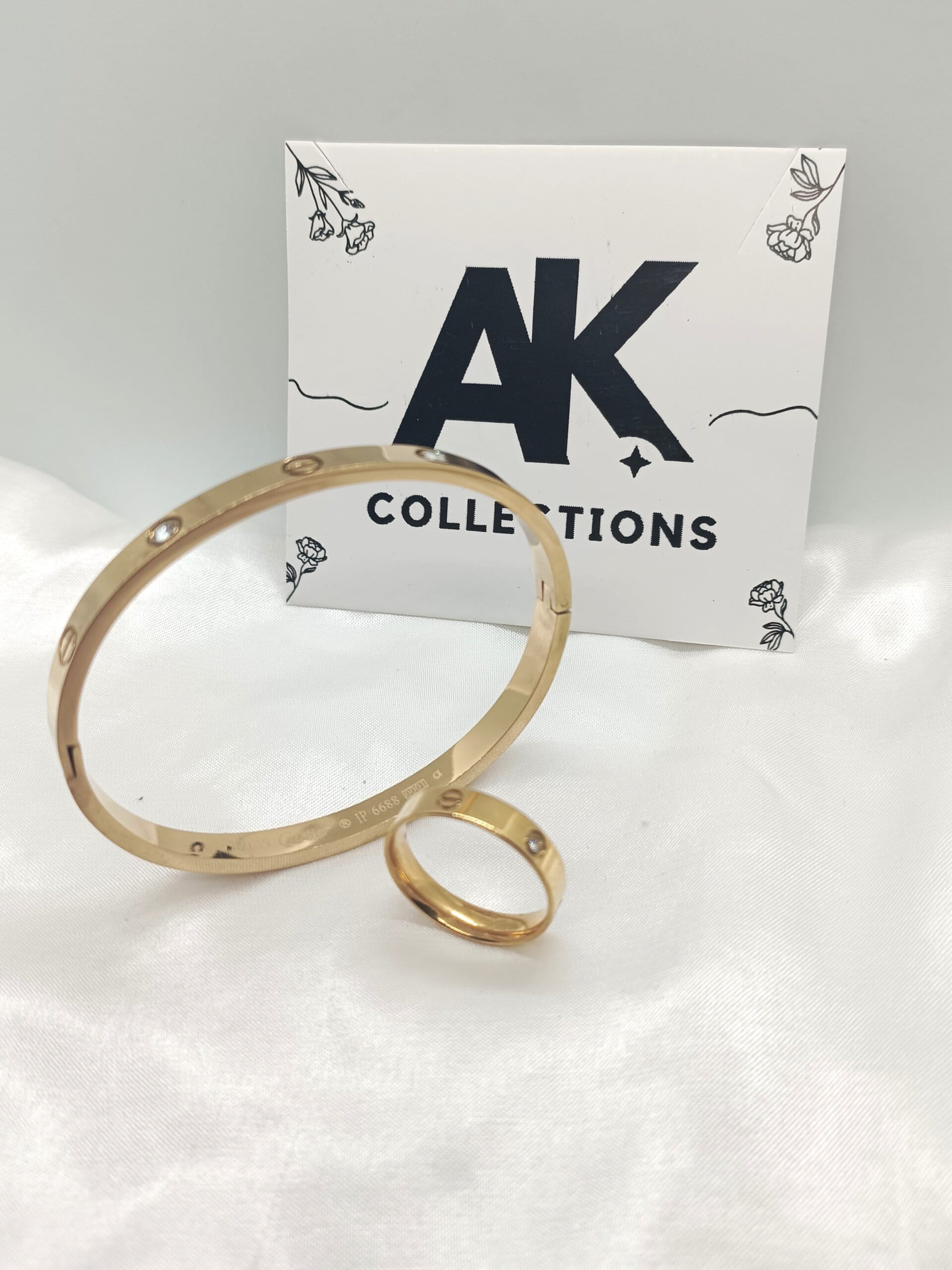 Stainless Steel CRTR Deal   Included ring+Bangle This bangle is perfect for daily wear, whether you’re out for a casual day or a formal evening. Its water and sweat resistance ensures that it maintains its luster no matter the occasion. Made from top-grade stainless steel, this bangle is stain-free, resistant to tarnish, and designed to withstand the test of time. Our stainless steel bangle is the perfect accessory for any outfit. With a sleek and modern design, this bangle is suitable for both casual and formal occasions. The bracelet is secured with a clasp fastening, making it easy to put on and take off